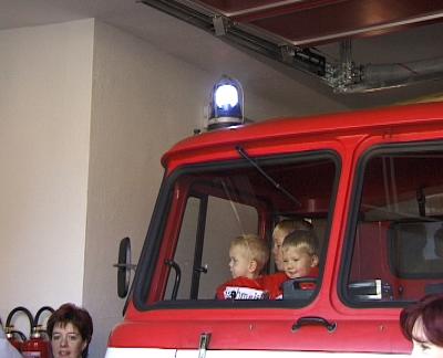 die es sich nicht nehmen ließen, das schon betagte Feuerwehrauto mit Blaulicht zu testen.